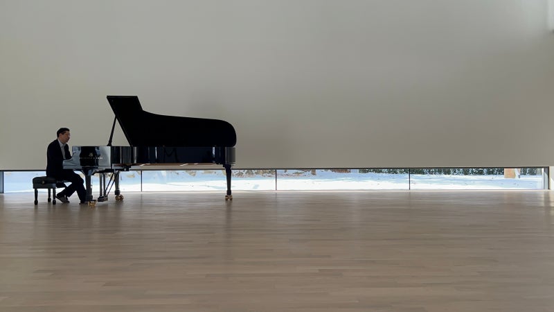 건축의 구조는 북동측 입구늘 캔틸레버로 들어올리고 그랜드 피아노의 배경이 되는 남서측 벽면을 강조했다. 상부에 북서측으로 열린 천창을 두어 아침 빛처럼 들어오게 만들었고 벽면 하부에는 그랜드 피아노 다리 높이보다 낮은 수평 띠창을 만들었다.