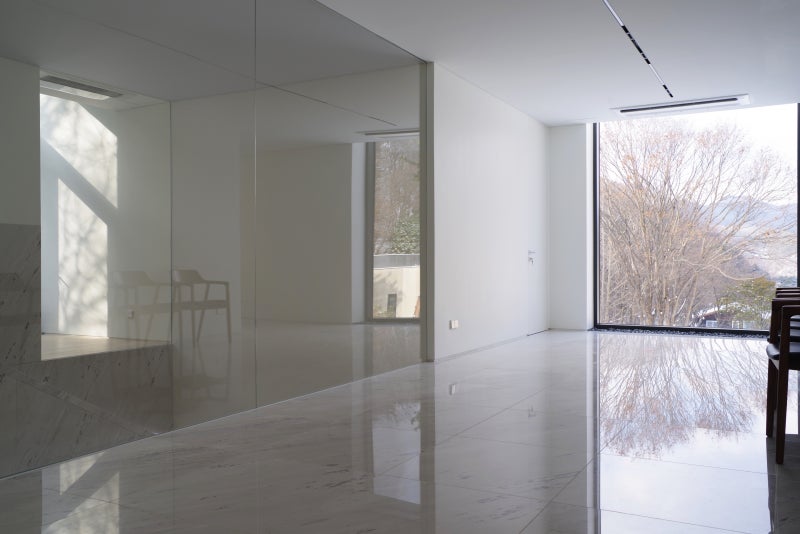 내부공간은 무채색에 가까운 백색의 공간을 만들었다. 백색 수성페인트와 밝은 오크 바닥재 그리고 폴라리스 대리석을 조합하였다. 피아노가 다니는 곳은 오크로, 사람의 공간과 이동은 대리석으로 그밖의 공간은 백색의 수성페인트로 마감하여 인공조명을 최소화 하였다. 대리석 마감은 사람이 닫는 곳으로 오염을 쉽게 청소하기 위한 방편이자 외부경관을 더욱 극적으로 끌어들이는 장치이다. 백색에 가까운 내부공간은 피아노가 주인이 되고, 데셍을 위한 석고상이 빛을 보기위해 백색인 것처럼 공연이 진행함에 따라 조금씩 변하는 공간의 빛의 변화가 잘 드러나도록 했다. 이를 위하여 천장을 가능한 깨끗하게 정리하고 흡음재도 굴곡이 없는 것을 사용하여 흡음과 반사 등 음향을 위한 장치조차 노출하지 않았다. 이곳의 '음악의 시간'은 변화하는 '자연광의 공간'과 함께 감상한다. 시각과 청각이 복합된 감각을 여는 여유가 있어야 이곳의 공연을 제대로 즐긴다.