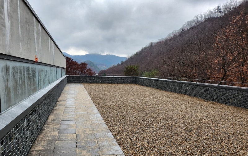 마지막 공간인 옥상은 자연의 공간이다. 개비온으로 올라온 파라펫의 윗공간에는 어떤 인공물도 보이지 않는다. 개비온과 자갈은 가장 자연에 가깝다. 저층부의 전망과 반대로 옥상에서의 풍광은 풀바리의 시설이 보이지않고 자연만으로 구성된 공간이다. 마치 하회마을의 한옥들이 낮은 담장너머로 자연만 보이는 것과 유사하다. 내부를 풍성하게 해준 천창의 빛은 역으로 이곳에 저녁 공간을 근사하게 만들어주는 조명이 된다. 마지막으로 현장에 원래 있던 현무암 바닥재를 깔았다.